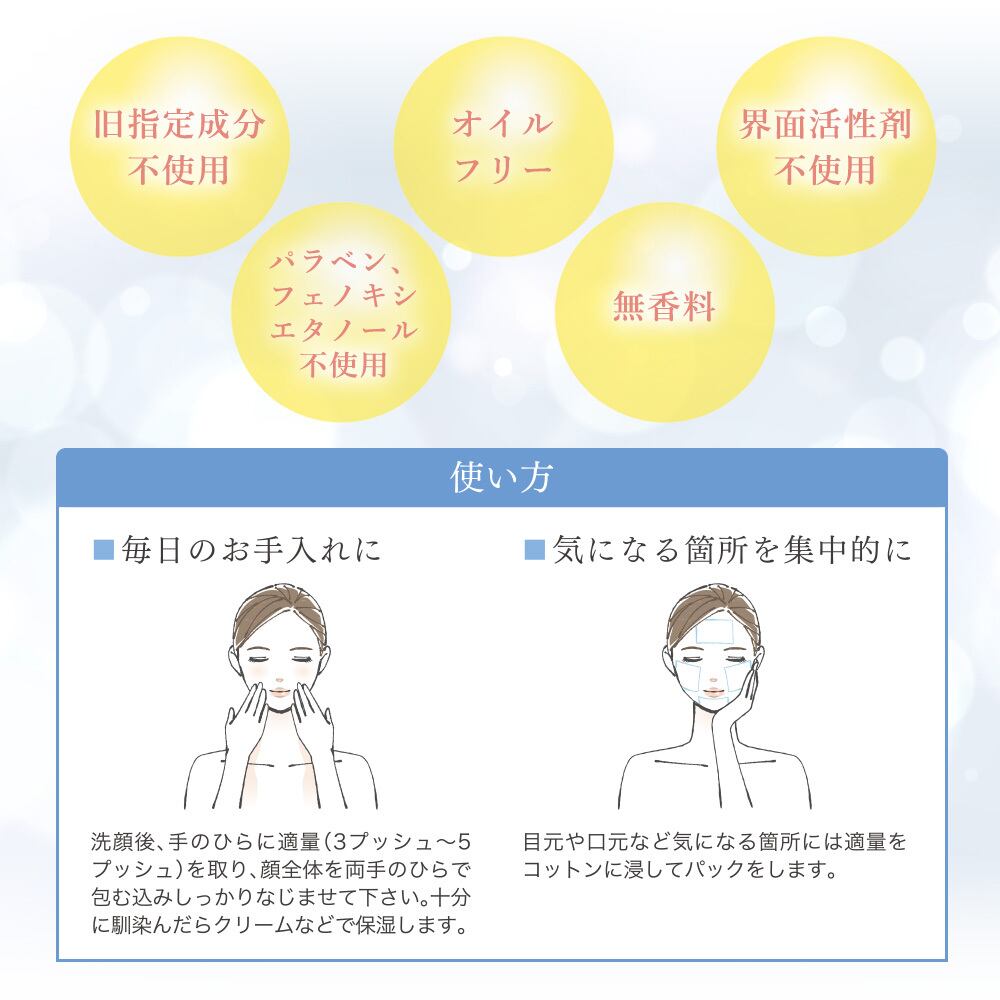 ❶ 洗顔後、適量を手に取り軽く顔全体になじませます。
